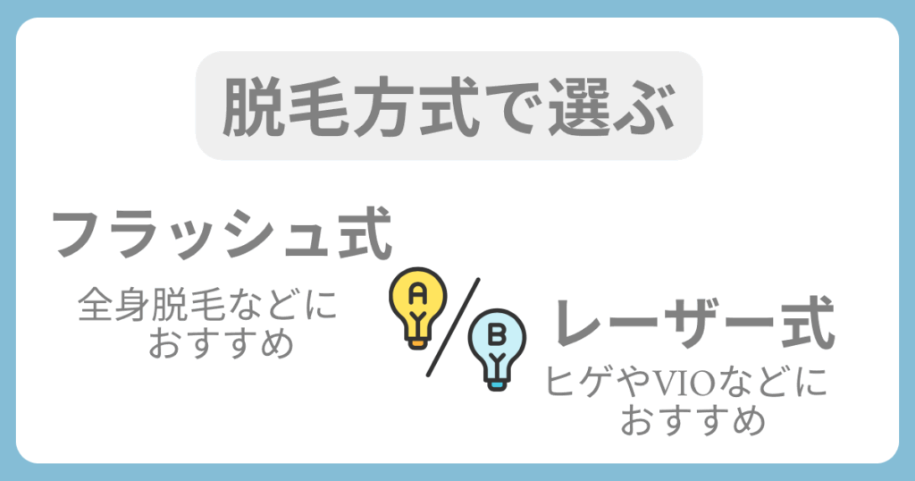家庭用脱毛器の脱毛方式は主に「フラッシュ式」と「レーザー式」の2種類です。