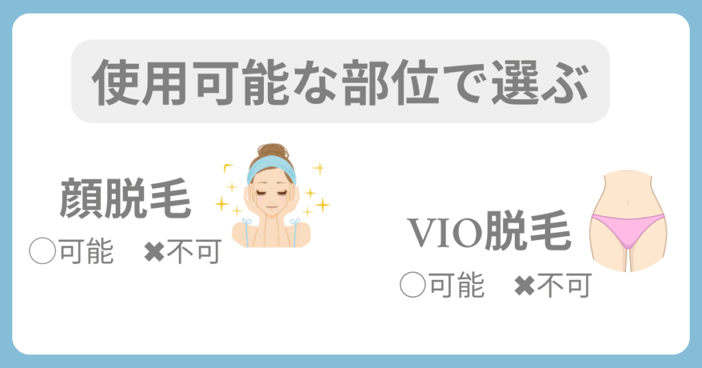 👩「他人にvioを見られるのが嫌で脱毛器を買ったのに、使用可能な部位に含まれていなかった」「顔の産毛を減らしたいのに顔脱毛できない」なんてことにならないように、使用可能な部位を購入前に必ずチェックしましょう!