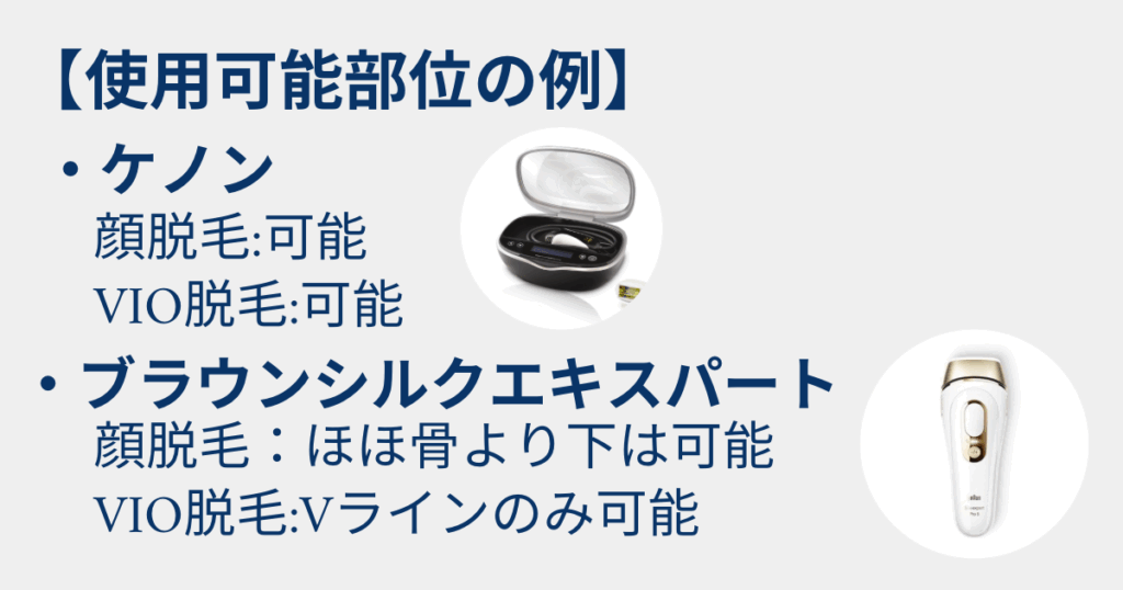 ケノンのように顔にもvioにも使用可能な脱毛器もあれば、ブラウンのように限れた部位にしか使用できない脱毛器もあります。