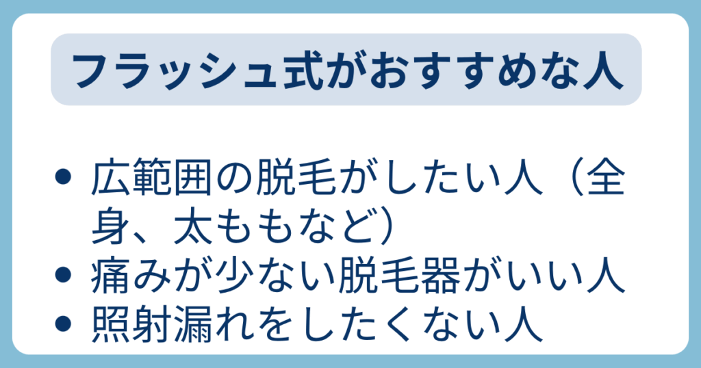 フラッシュ式は「痛みを感じにくい」&「照射もれが少ない」ため、家庭用脱毛器を初めて使う人におすすめです。