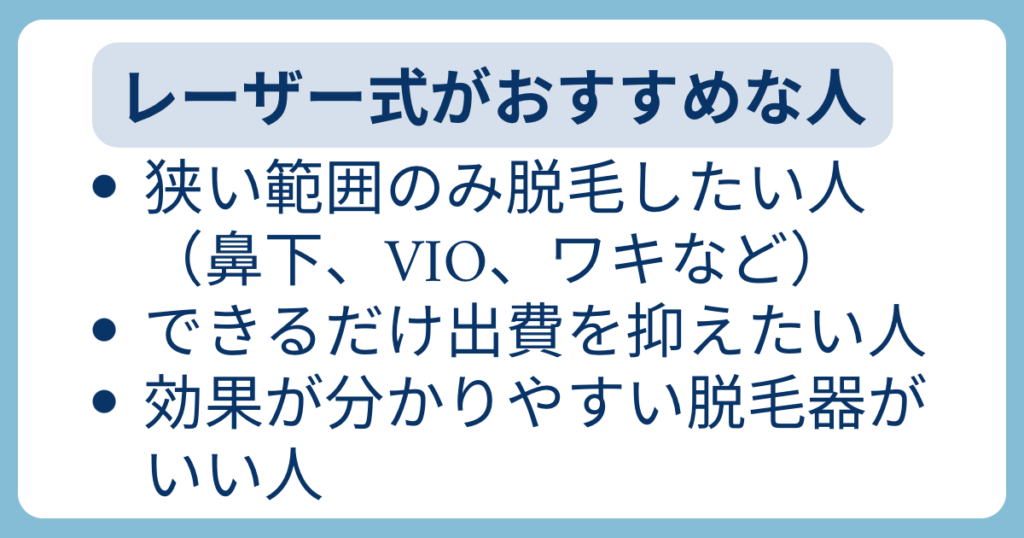 👩私は全身脱毛が目的だったのでフラッシュ式のケノンを購入しました。vioや鼻下など細かい部位のみ脱毛したい人にはレーザー式がおすすめです。